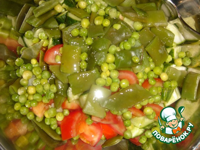 В той же воде, где варилась капуста, сварить фасоль и горошек. Если у вас консервированный горошек, просто слейте жидкость. Отваренные горошек и фасоль вынуть на дуршлаг и остудить.