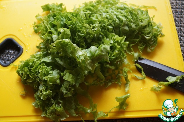 Режем салат в виде лапши. Именно режем, а не рвём. Наш салат не имеет первобытный вид, он строг и эстетичен.