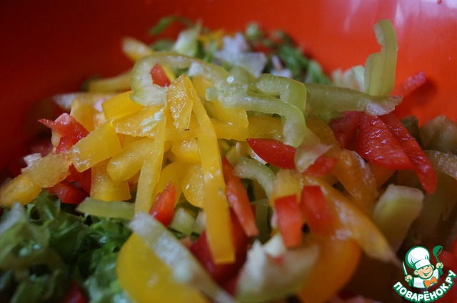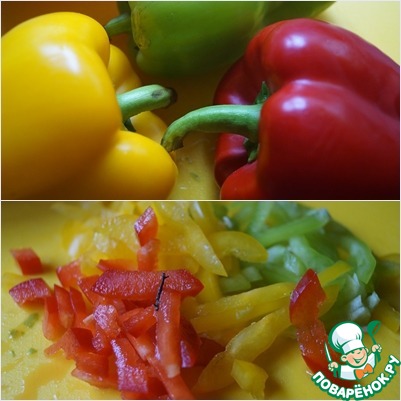 Болгарский перец моем и режем соломкой. По рецепту нам нужна одна штука. Но я подумала, что будет красивее, если перец будет разноцветным. Просто отрезала по куску перца каждого цвета.