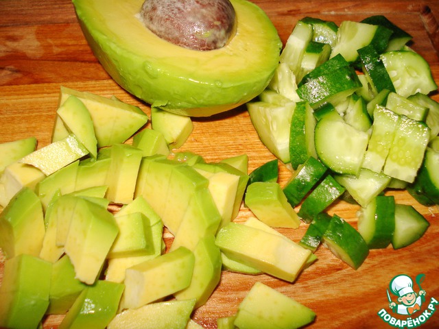 Огурец порезать кубиками. Авокадо почистить и то же порезать кубиками.