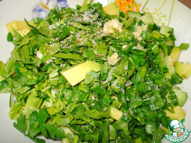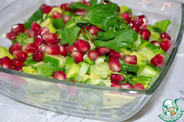 | Легкий салат из огурцов и авокадо, с петрушкой, зеленым луком и чесноком. Заправляется просто соком лимона, посыпается зернами граната. |