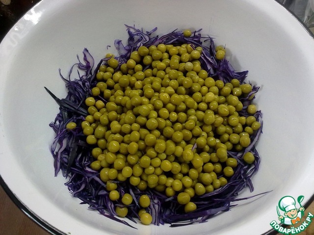 Горошек сразу можно добавить к капусте, предварительно слив жидкость.