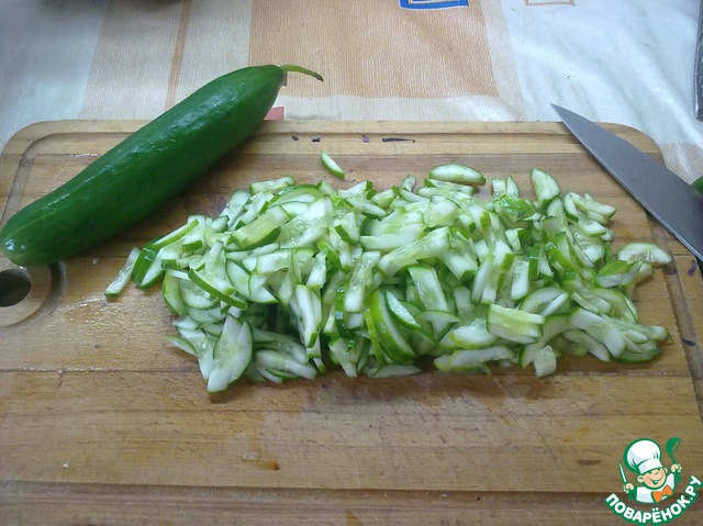 Огурчики режем соломкой и тоже в миску.