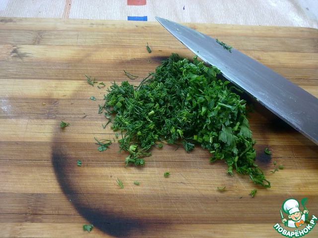 Зелень мелко рубим и все в ту же миску.