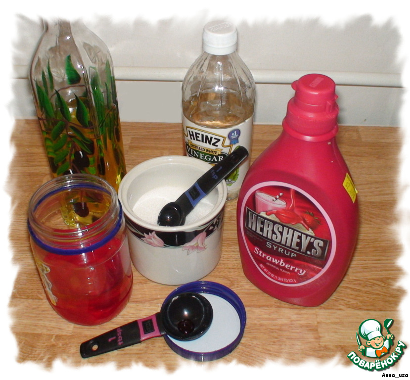 Для начала приготовим заправку. В небольшой закрывающейся банке смешиваем оливковое масло, сахар, уксус, клубничный сироп и клубничный ликёр(если вы его используете).