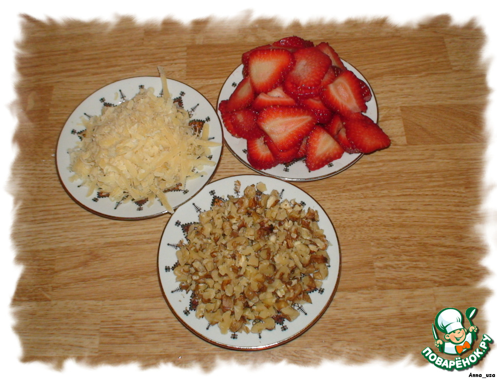 Клубнику помыть, обсушить и порезать слайсами. Сыр натереть на крупной тёрке, орехи порезать не очень мелко.