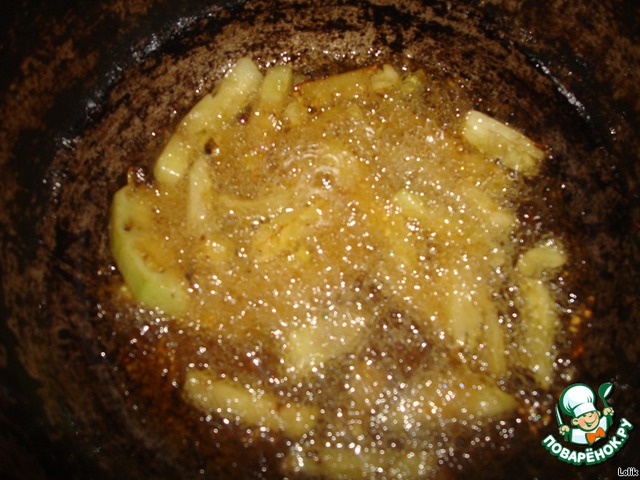 Обжариваем очищенные и нарезанные брусочками баклажаны.