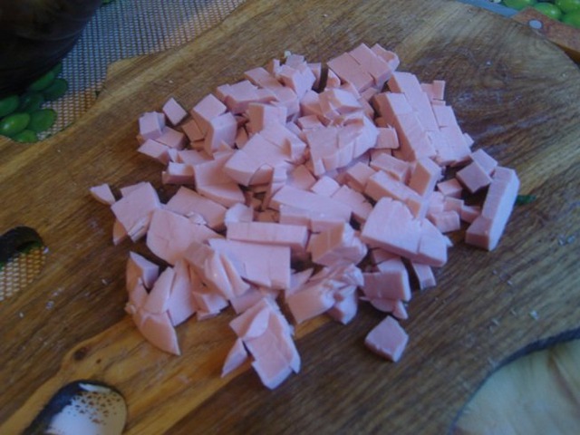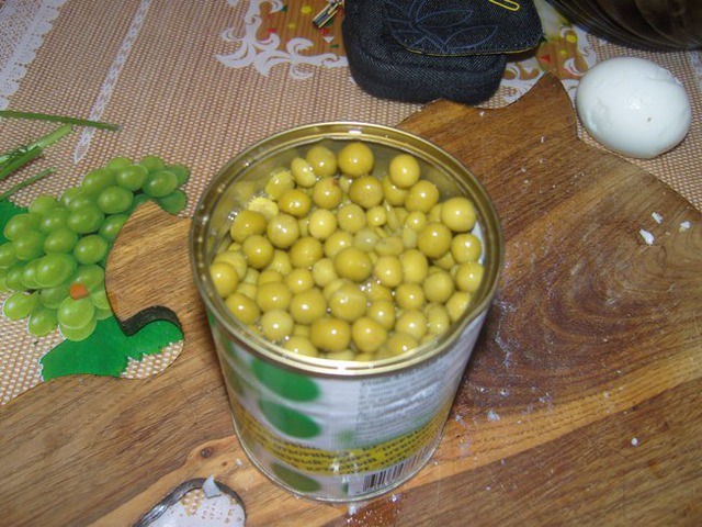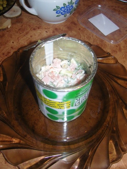 7. Занимаемся сервировкой: срезаем крышки с банки от горошка с обеих сторон. Ставим на тарелку и выкладываем в эту формочку салат. Немного прессуем и осторожно вытаскиваем формочку.