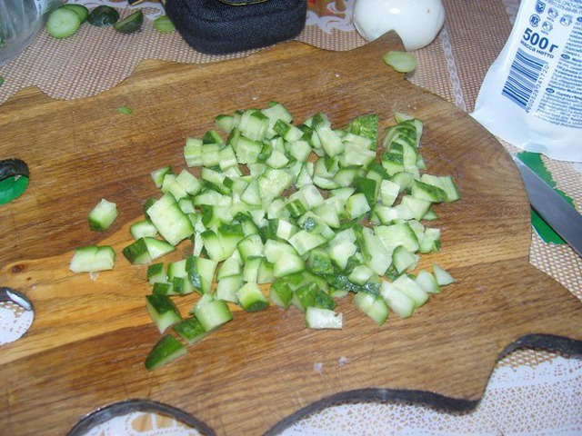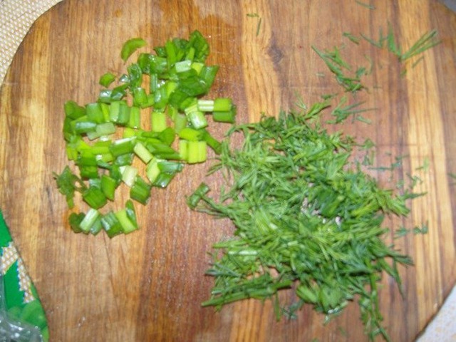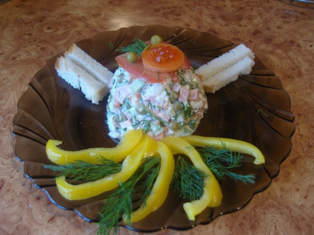 • Тарелочку украшаем ломтиками сладкого перца, укропом и палочками батона.