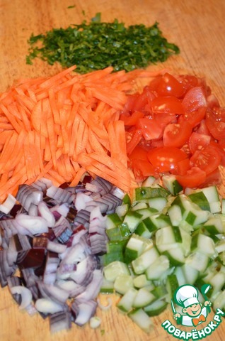 Петрушку измельчить. Помидоры черри развезать на 8 частей, морковь натереть на курупной терке. Лук и огурец нарезать кубиком.