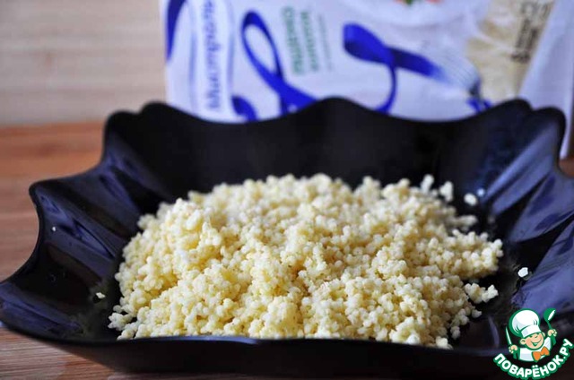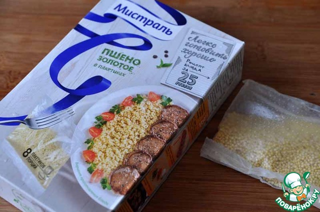 Пакетик готового пшена достаём вилкой, даём воде стечь, надрываем пакетик, кладём пшено на тарелку и даём немного остыть.