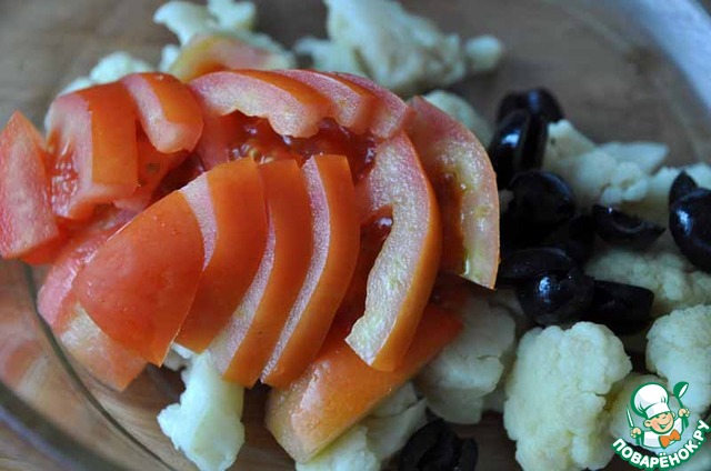 Добавляем к капусте нарезанный на дольки помидор и на половинки маслины.