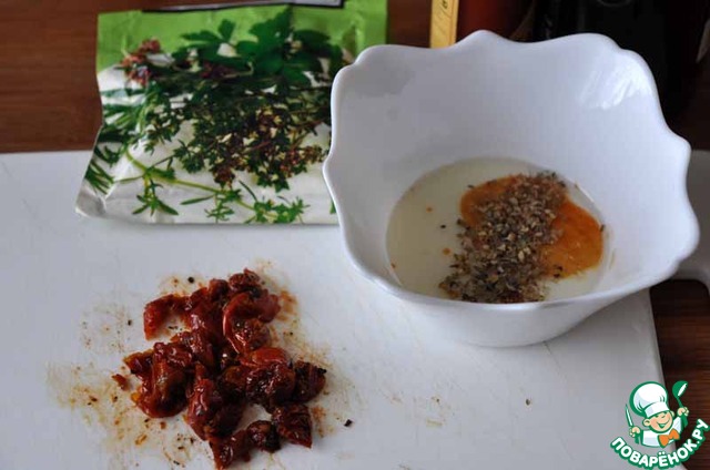 Берём вяленые томаты и мелко рубим. Оливковое масло, бальзамический уксус, лимонный сок, соль, чёрный молотый перец, табаско и орегано взбиваем венчиком, к ним же добавляем порубленные вяленые томаты. Я добавила ещё заправку от самих вяленых томатов.