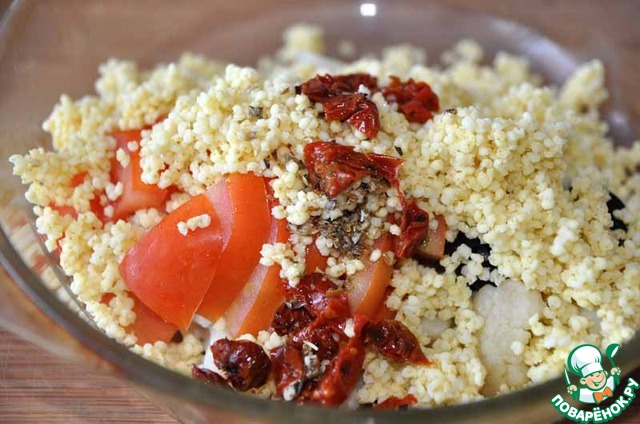 Добавляем пшено к овощам, заливаем заправкой, перемешиваем.