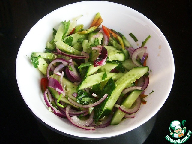 Смешать уксус, сахар. Можно добавить чайную ложку соевого соуса. Добавлять ли соль - решайте сами. Размешать. Добавить огурцы, лук, перец и кинзу. Дать постоять минут 10 - 15 и подавать на стол. Очень вкусный, интригующе-острый, вызывающий аппетит салат. Есть в нём какая-то особая, неуловимая прелесть. Он запоминается.