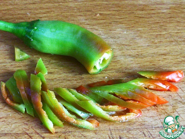 Перец режем полосочками, предварительно удалив семена и белые перегородки. В них - основная острота и жгучесть. А если вам нравится острота в салате - оставьте часть семян, по вкусу.