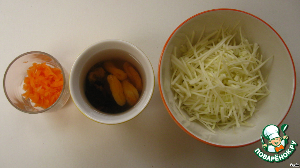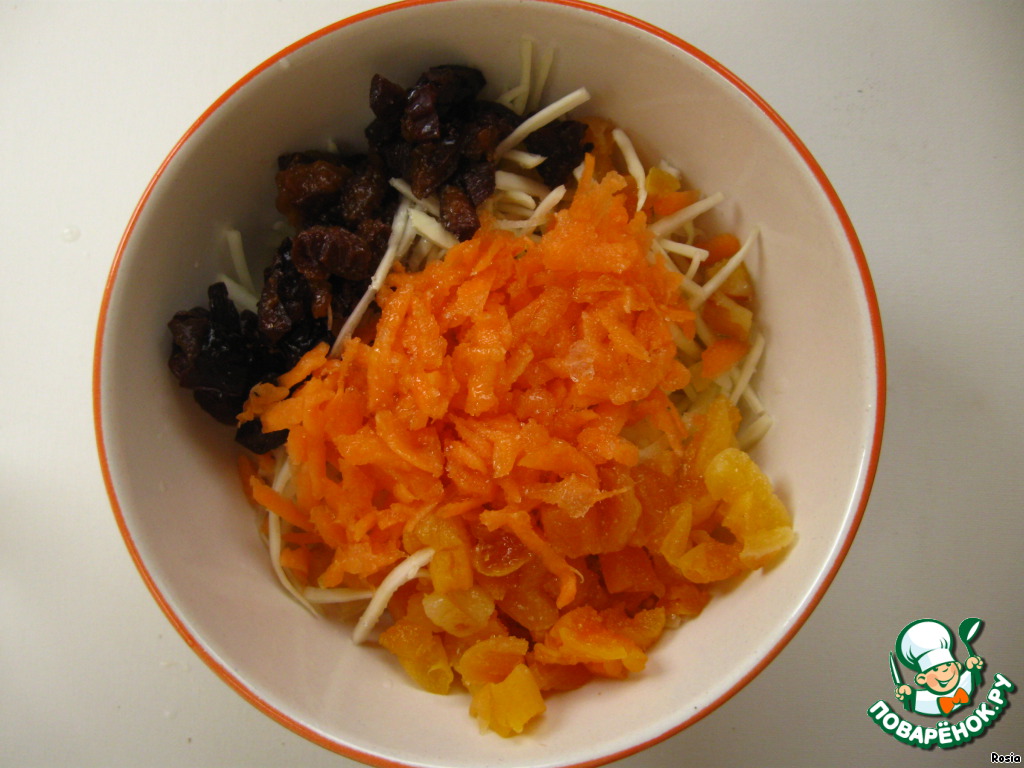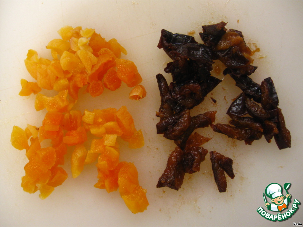 Чернослив и курагу промокнуть салфеткой или бумажным полотенцем. Нарезать кубиками.