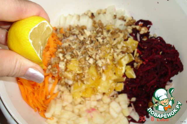 Из половинки лимона выдавить сок в салат и перемешать, немного посолить.