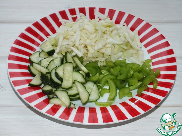 Тем временем нужно нарезать огурцы, капусту и сельдерей
