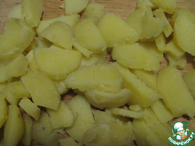 Картофель отварить в мундире, остудить и нарезать полукругами.