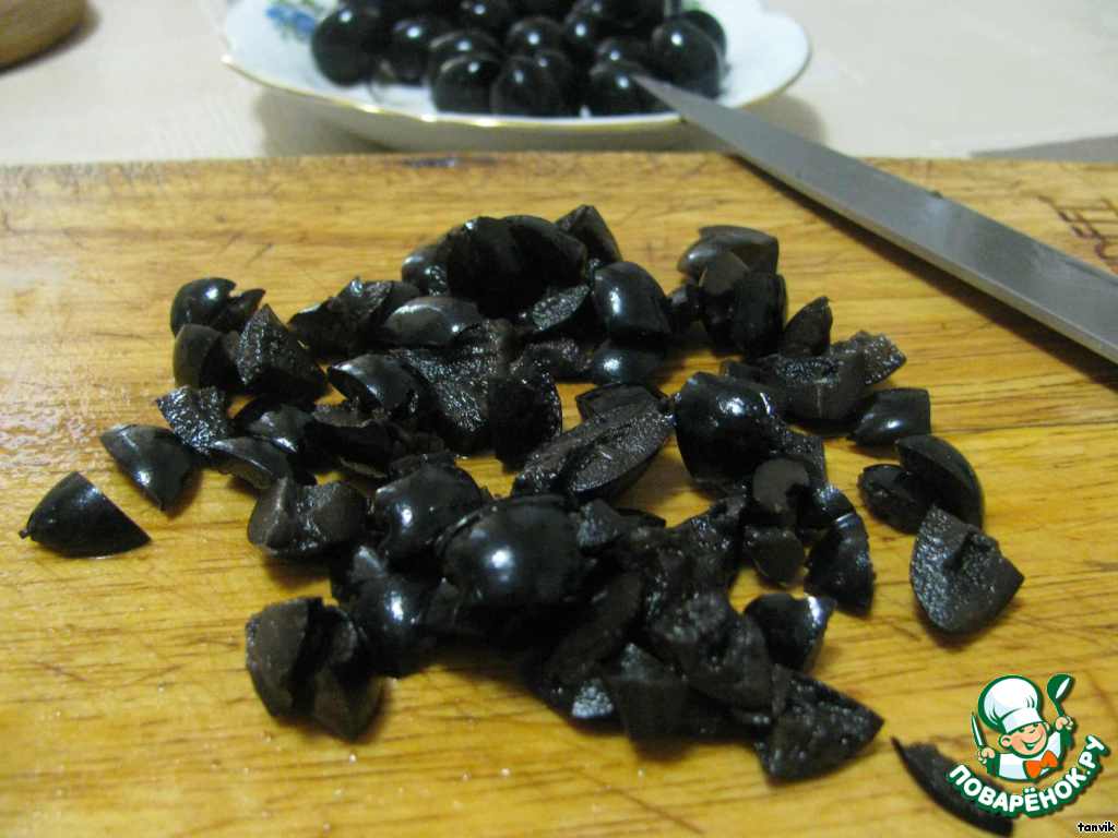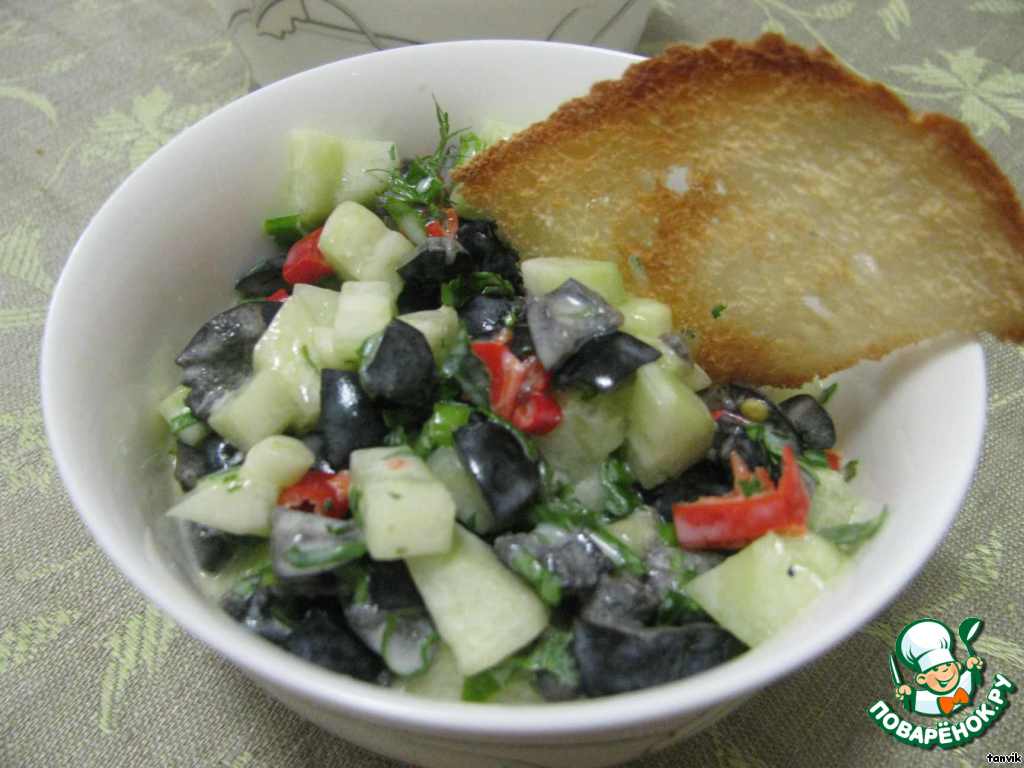 6. Добавить огурцы, маслины, перец чили. Перемешать, и салат готов.