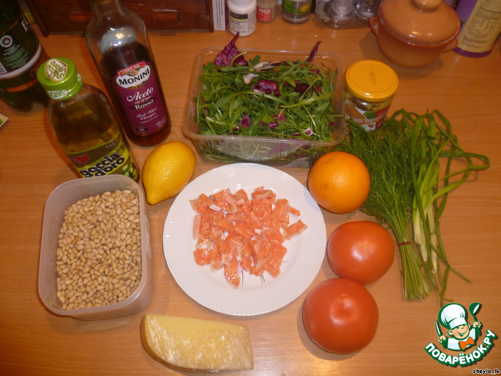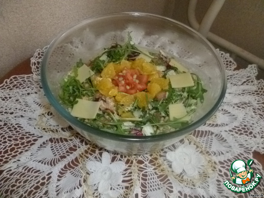 Далее украшаем. Вырежем филе апельсина" в центр положим розочку из помидора, вокруг апельсин, тоненькие кусочки сыра, посыпем кедровыми орешками. Приятного аппетита.
