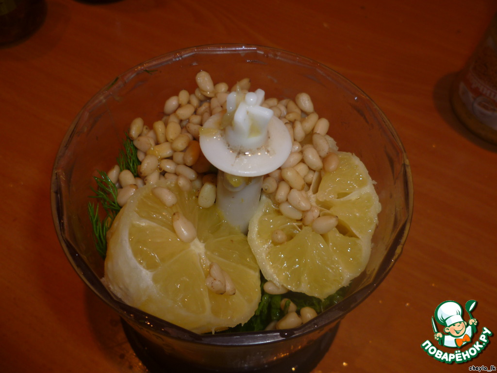 Далее лимон (я разрезала на 2 половинки и выковырнула из шкурки), половину кедровых орешков, немного соли, перца, оливкового масла, уксуса, горчицы (у меня была дижонская). Взбиваем в блендере.
