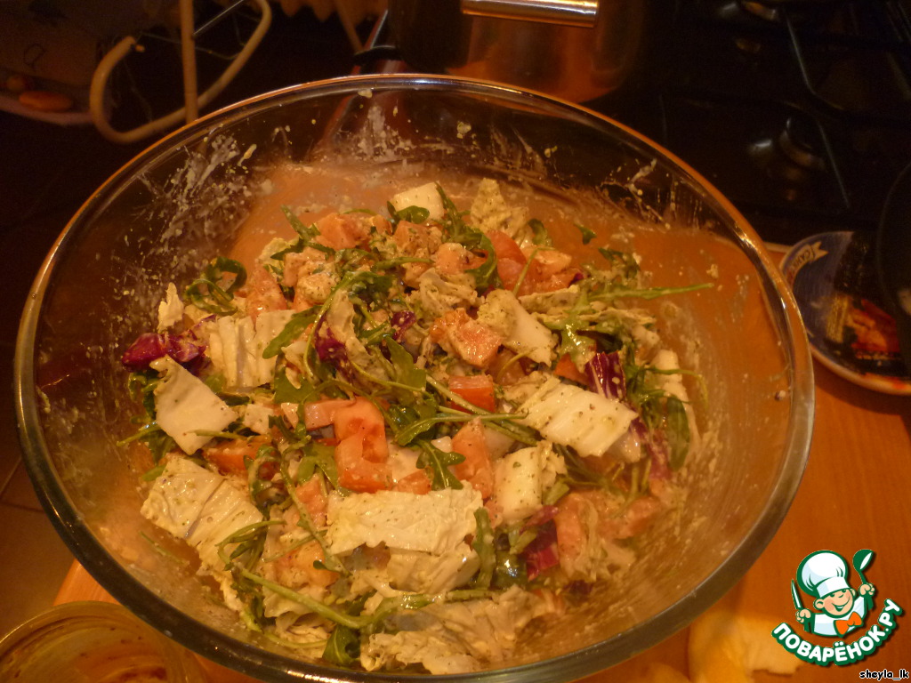 | Не судите строго. Это мой дебют. Салат был придуман к новогоднему застолью. Собирался экспромтом, но получилось очень вкусно. Для любителей легких салатов, следящих за фигурой, но не готовых отказываться от вкусной еды. По мотивам итальянской кухни. |