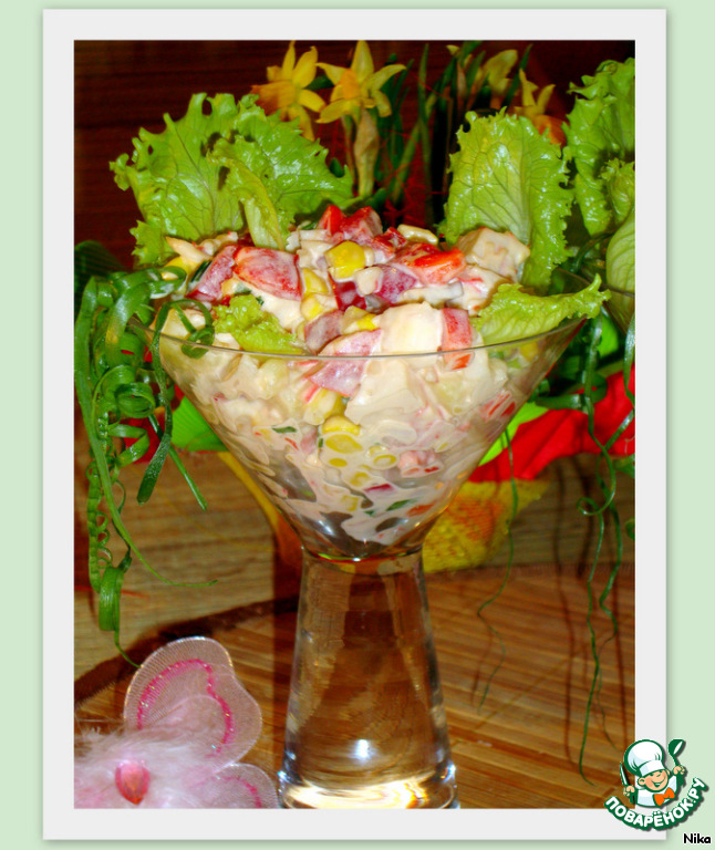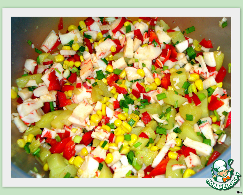 Я решила, что не хватает яркости, и добавила кукурузу. Очень люблю её в салатах. Она придаёт салату сочность, сладость и красоту.