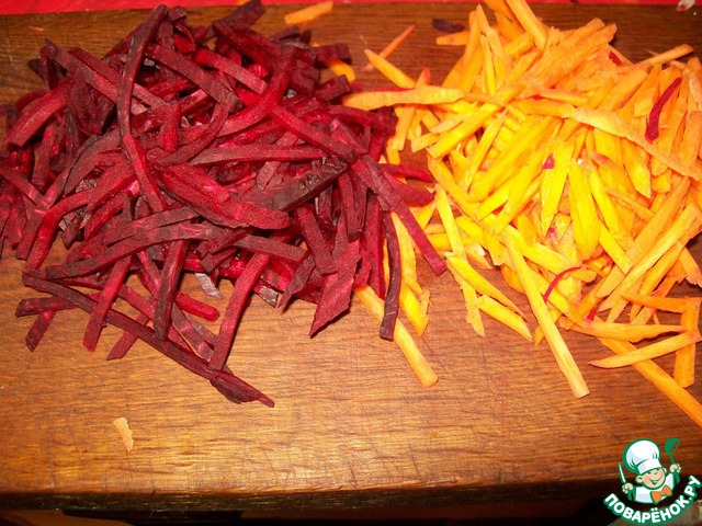 Трем на терке для корейской моркови морковь и свеклу. Овощей должно получиться примерно одинаковое количество.