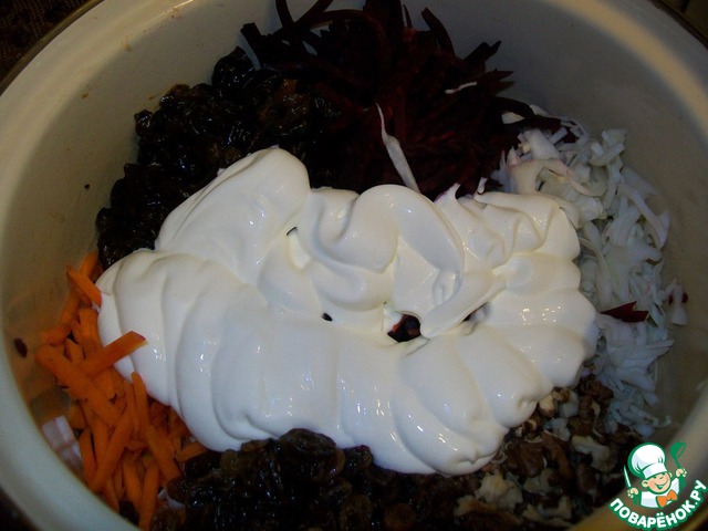 | Все мы знаем о пользе сырых овощей, только некоторые в сыром виде едим редко (например, свеклу). Вот я и вспомнила о любимом мной салатике, приятную сладость которому придают изюм и чернослив. Похрустите на здоровье! |