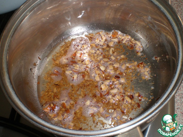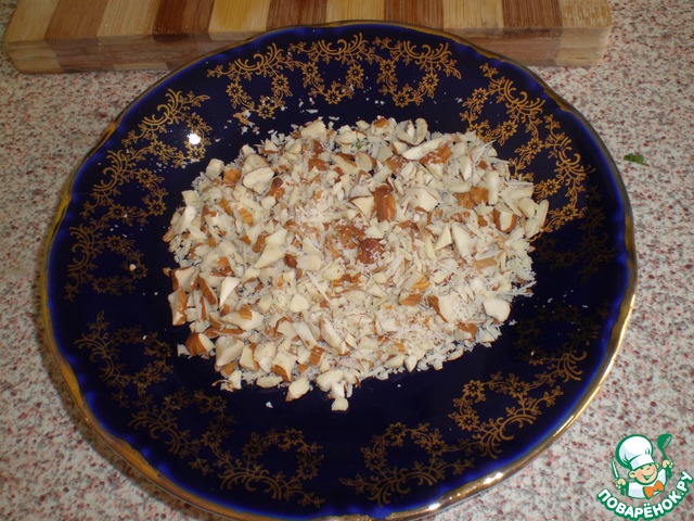 Миндаль порубим очень мелко. Можно блендером, просто мой блендер на "гастролях" у подруги и я порубила ножом.