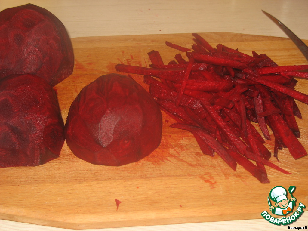 Свеклу помыть и очистить. Нарезать тонкой соломкой (можно воспользоваться теркой для моркови по-корейски). На сковороду налить растительное масло и положить свеклу. Тушить под крышкой приблизительно один час, периодически перемешивая и при необходимости подливая воду.
