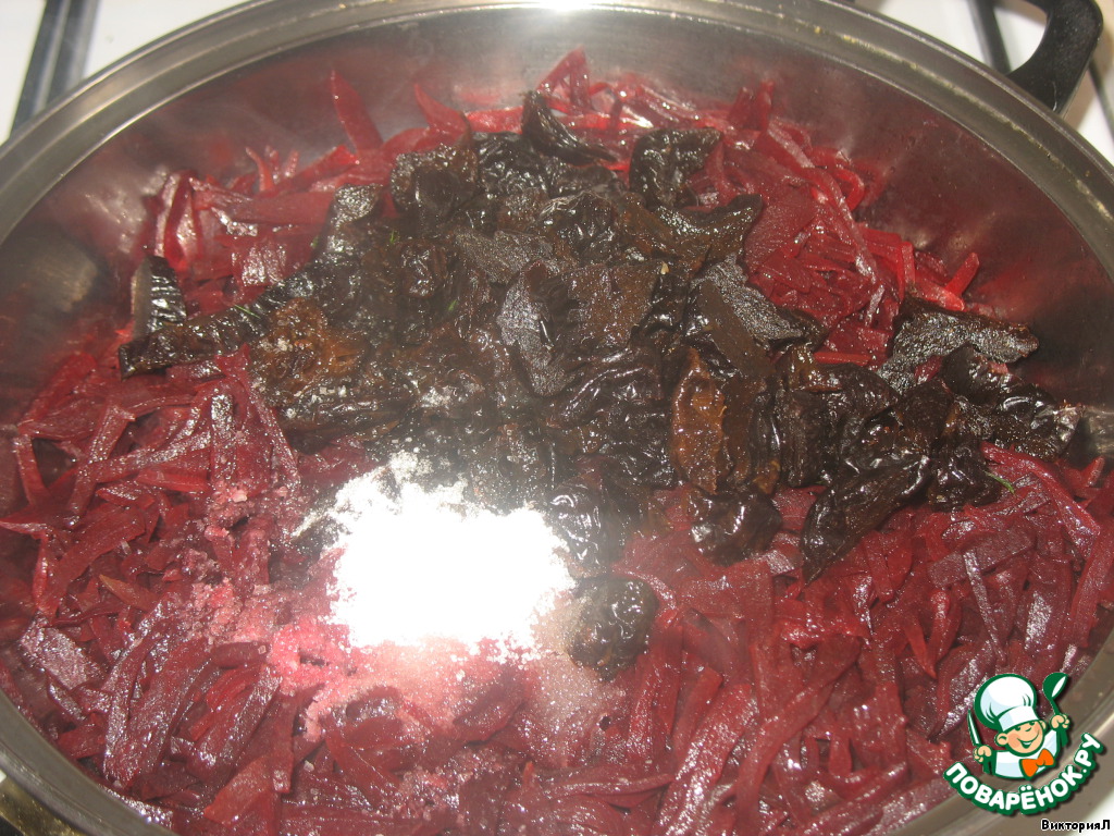 Затем добавить по вкусу соль, сахар, уксус (лимонный сок), вымытый и порезанный чернослив. Тушить под крышкой еще минут 20-30.