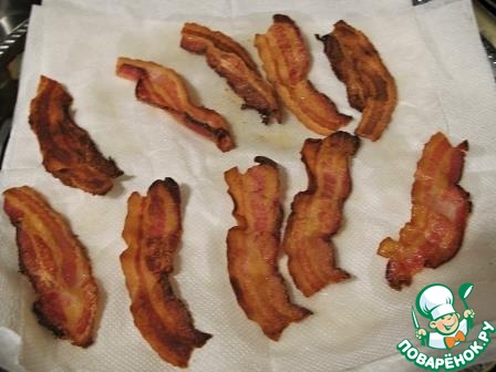 Бекон обжарить до хрустящей или мягкой корочки (как вам больше нравится) и выложить на бумажные полотенца.