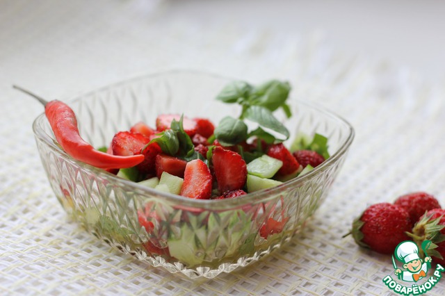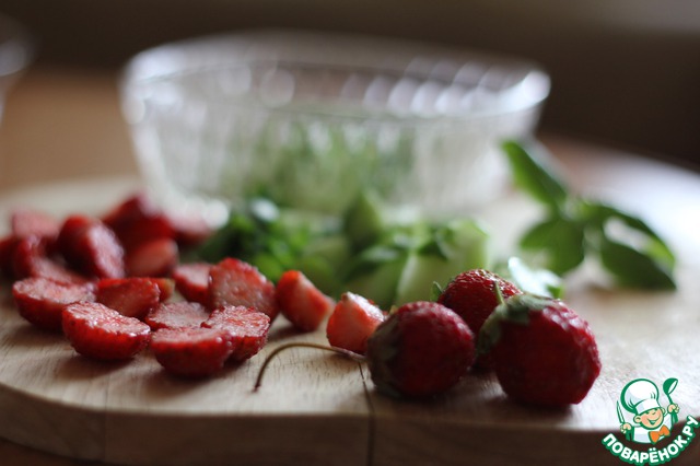 Клубнику нарезать мелкими кубиками. Огурец можно очистить, если кожица грубая, нарезать такими же кубиками как и клубнику. Нарезать мелко базилик, шнитт- лук, сельдерей.