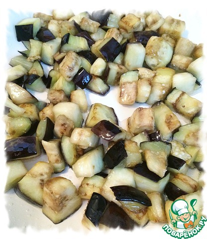 Кубики баклажана обжарить на оливковом масле до полуготовности (минут 5)и переложить в отдельную посуду.