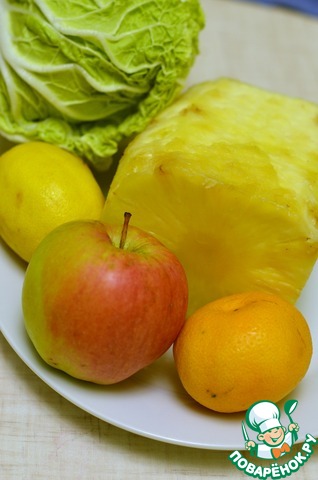 2. Капусту нашинковать. Яблоко почистить и натереть на крупной терке. Ананас нарезать кубиком. Мандарин очистить от шкурки и пленок и нарезать каждую дольку на 2-3 части.