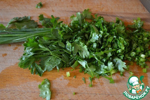 Приготовить заправку: мелко измельчить ножом петрушку, кинзу и зелёный лук.