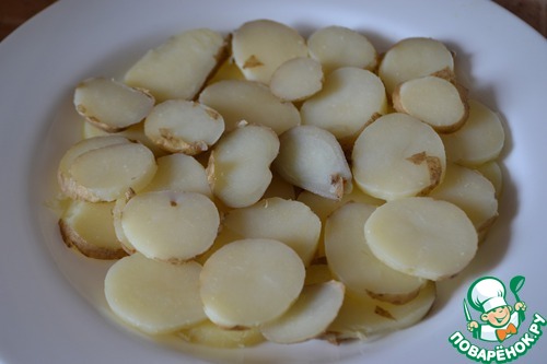 Картофель нарезать кружочками. Выложить на плоское блюдо.