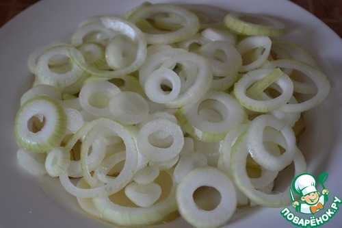 Лук нарезать кружочками. Расслоить и выложить поверх картофеля.