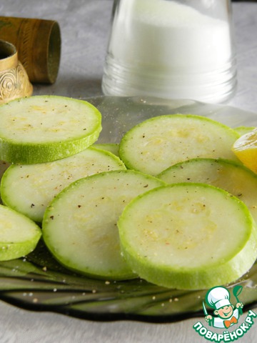 Цуккини посолить, посыпать перцем, сбрызнуть лимонным соком и маслом. Немного запечь в духовке или аэрогриле (я делала в аэрогриле при температуре 200 10-12 минут).
