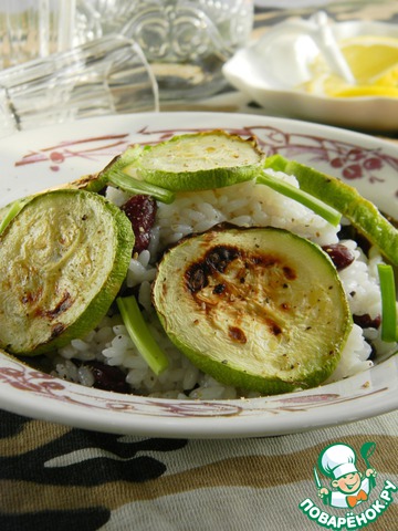 Выложить на тарелку, сверху - кружочки подпеченного цуккини. Полить заправкой. Зелень не повредит.