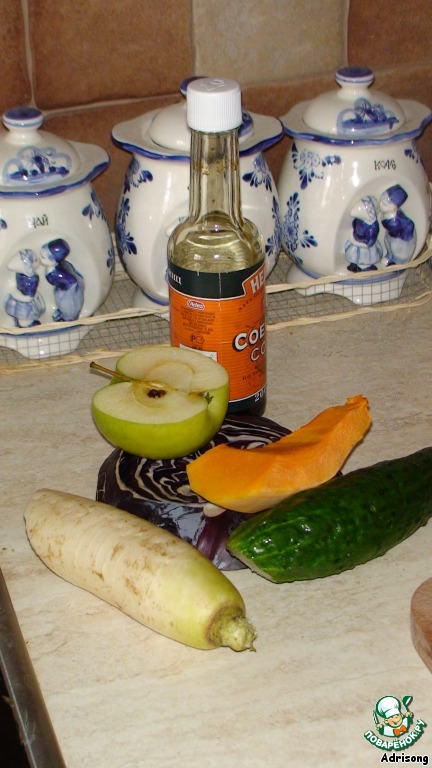 Нам понадобятся: дайкон (половинка, а может быть и больше, чем больше, тем острее), яблоко, огурцы свежие, кусочек тыквы - для придания яркости, соль + соевый соус.
