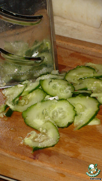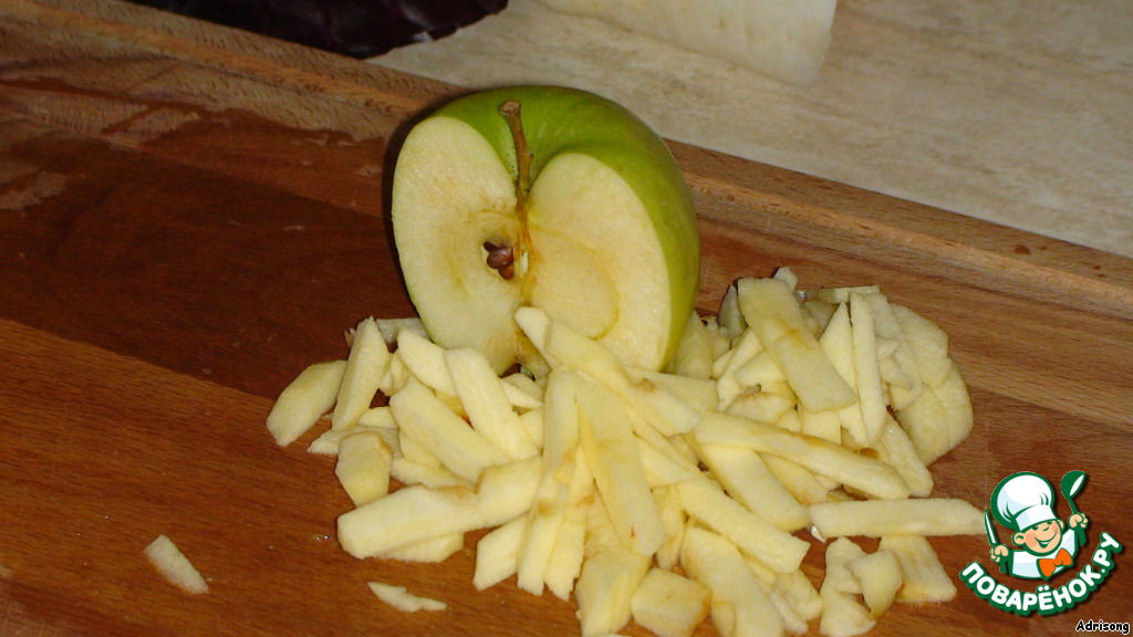 Затем, нарезаем яблоко тонкими ломтиками и отправляем вслед за огурцами.