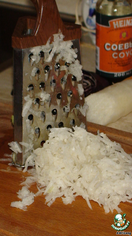 Пришла очередь дайкона. Он подвергся шинкованию на крупной тёрке, но можно и на мелкой.