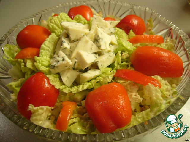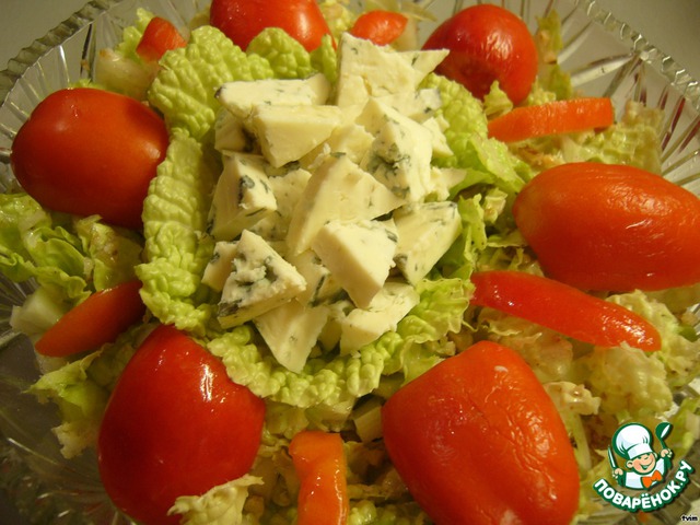Сверху укладываем порезанные помидорчики. А из "верхушек" капусты делаем кулечек, в который укладываем наш слегка голубой сыр. Мне почему-то нравится резать его маленькими треугольничками ))) Вот и все!