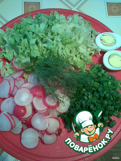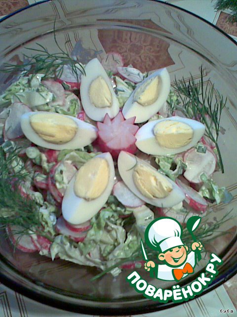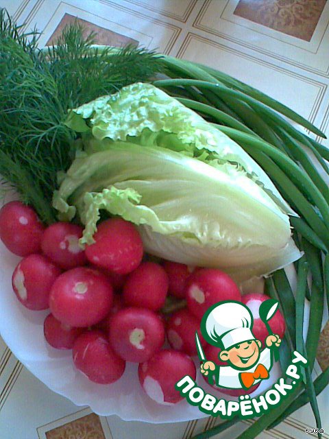 | Салат хоть и овощной, но сытный. Весной так хочется редисочки, зелени - думаю, мой вариант будет кстати.... |
