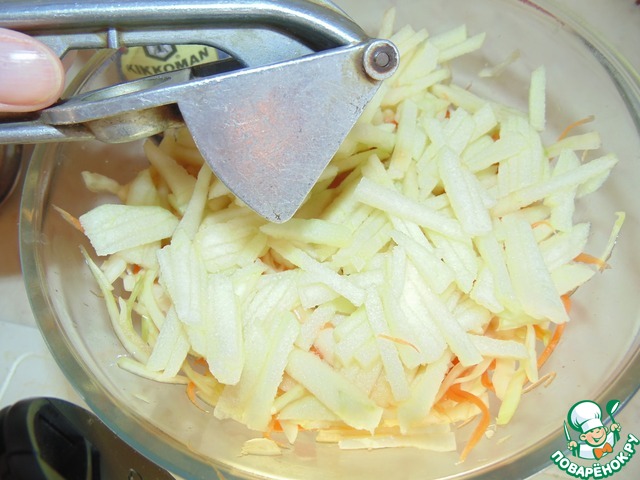 Половину большого, зеленого яблока очистить и нарезать соломкой.