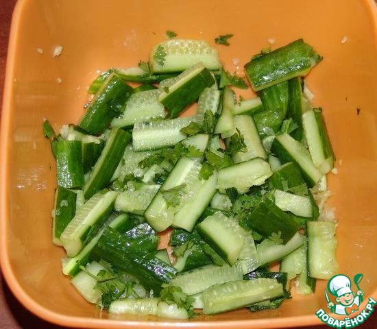 Порезать огурцы брусочками, смешать с листьями кинзы и измельченным чесноком